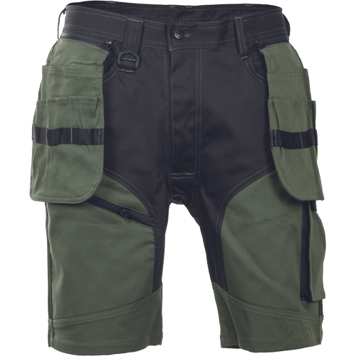 Miesten työssä käytettävät kestävät shortsit joustavasta materiaalista; monikäyttöiset taskut; 2 irrotettavaa lentotyökalutaskua edessä; koristetikkaukset.