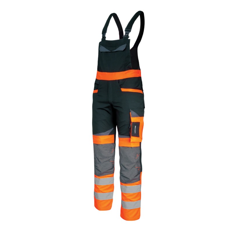 Heijastavat nauhat standardin EN ISO 20471 mukaisesti. 9 taskua, joista 1 vetoketjullinen. Tasku matkapuhelimelle. Muita heijastavia inserttejä, jotka lisäävät turvallisuutta työn aikana. Kolminkertaisesti ommellut saumat. Saumojen lisävahvistus haara-alueella.
