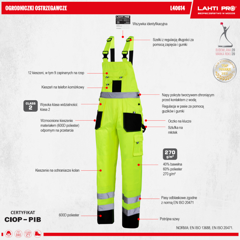 Kaksinkertaiset saumat, 12 taskua, joista 9 koukku- ja lenkkikiinnityksellä, polvisuojataskut, vyötärön säätö napeilla ja kuminauhalla, muovipinnoitettu puristinnasta vesisuojaukseen, henkilöllisyystunniste, matkapuhelimen tasku, taskut vahvistettu kulutusta kestävällä materiaalilla (polyesteri 600D), kolminkertaiset saumat, avaimenperän reikä, vasaran pidike.