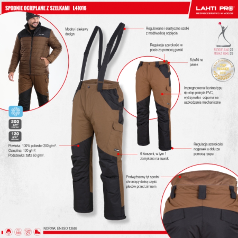 Pehmustetut housut housunkannattimilla. Kyllästetty ripstop-kangas, jossa on PVC-pinnoite. Kestävä. 6 taskua, joista 1 vetoketjullinen. Säädettävät, joustavat ja irrotettavat tukiraudat. Pidennetty takapuoli suojaa selkää kylmältä. Vyötärön leveyden säätö joustavalla nauhalla. Vyölenkit. Jalkojen pohjan leveyden säätö tarranauhalla. Muodikas ja mielenkiintoinen muotoilu.