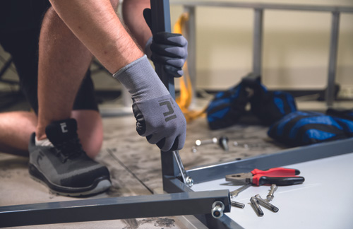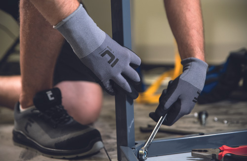 Saumattomasti neulotut suojakäsineet; materiaalina nylon/elastaanipinnoite kämmenessä ja sormissa.